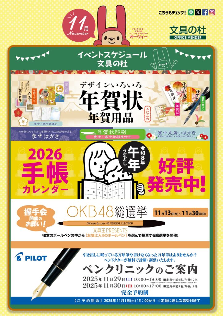 店舗で利用可能な割引サービス7/19 「みやポ」が使えるようになりました10/1【Bun2】10月号 発刊のお知らせ11/13【第15回OKB48選抜総選挙】握手会開催11/29・30 パイロット ペンクリニック開催全店 イベント情報!!